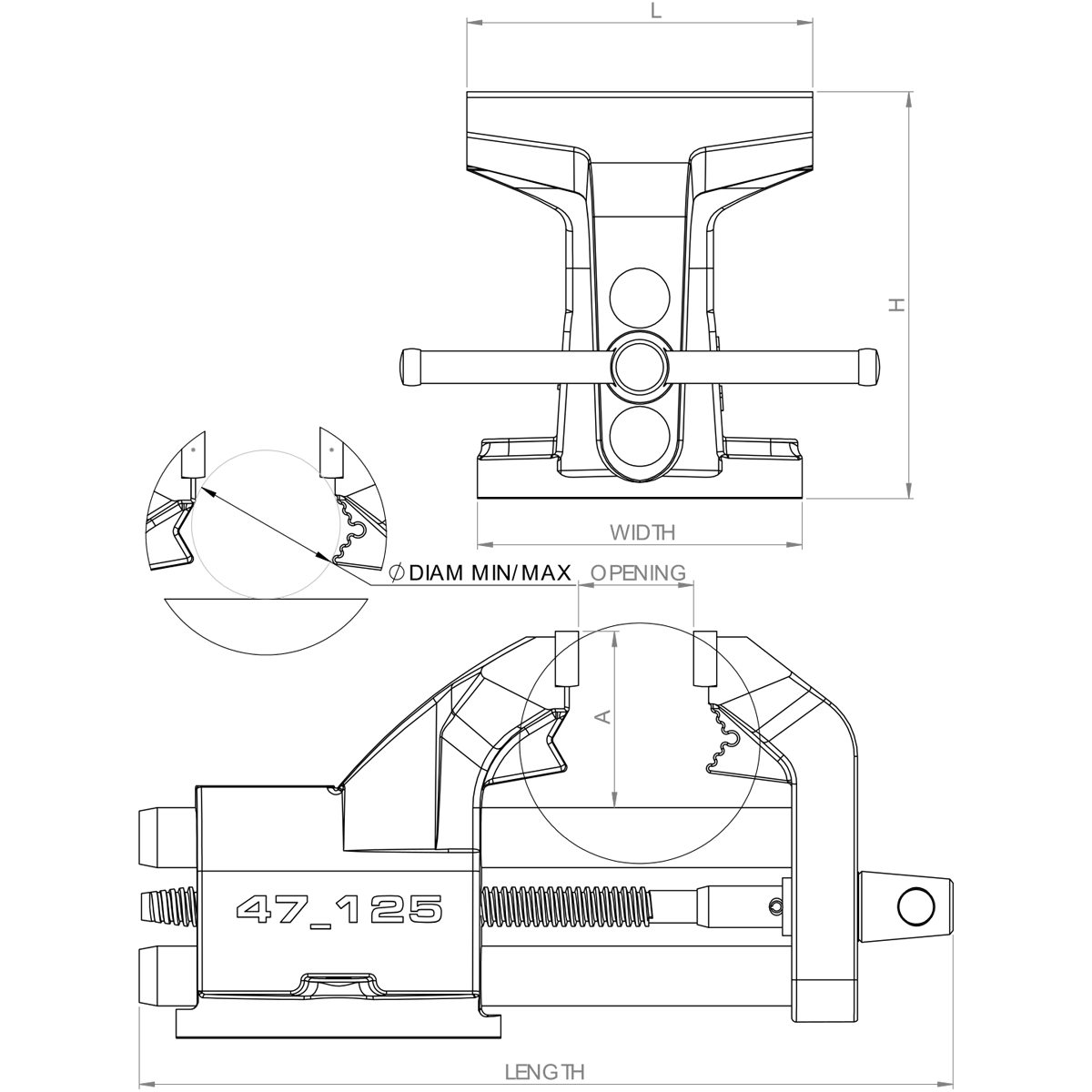 TypeLength (mm)Width (mm)Height (mm)Open (mm)A (mm)Minimum/maximum diameter (mm)L (mm)Weight (kg)