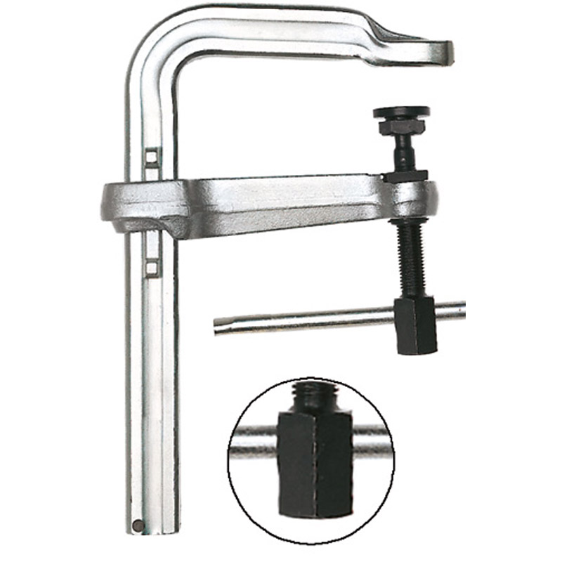 Clamping force up to 35,000 N at tightening torque of 100 Nm Long life due to heat-resistant pressure plate with sintered steel insert, which can be tilted up to 35° With 36 mm hexagonal bolt on the end of the spindle With wedge for fixing the sliding arm