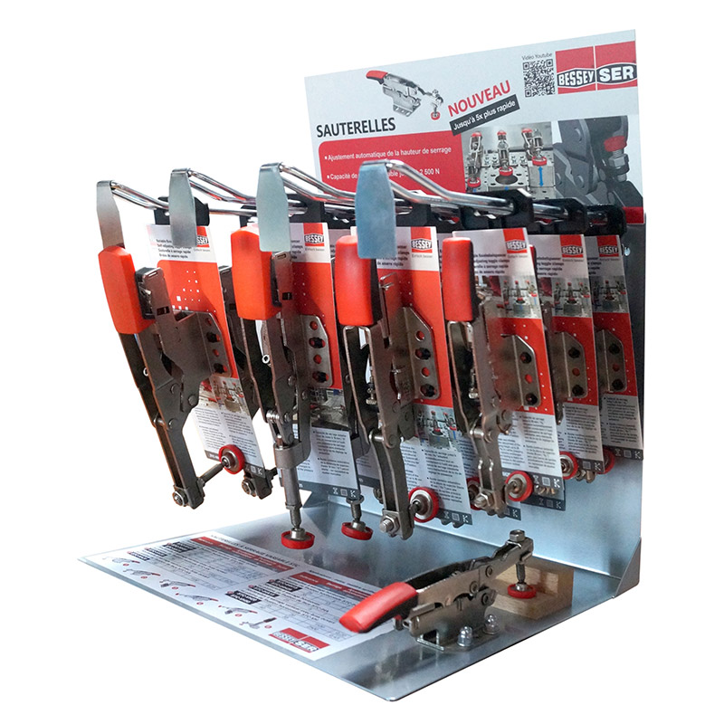 Professional sales display with 4 perforated-panel hooks Optimum presentation of the toggle clamp Comes equipped with 12 toggle clamps mounted on hanging cards and 1 toggle clamp for demonstration purposes The display can be refilled at any time