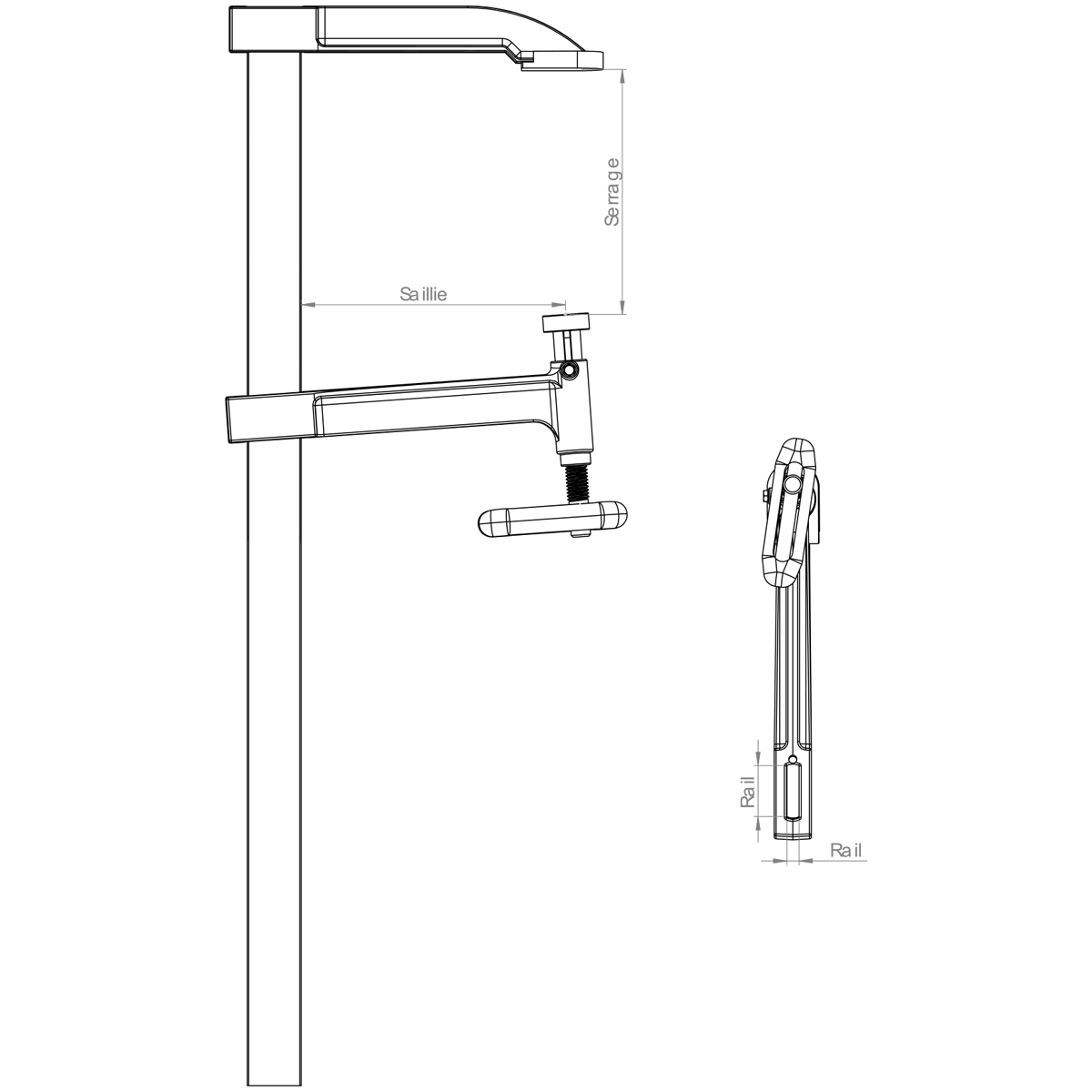 | Longueur (mm) | Largeur (mm) | Hauteur (mm) | Force (daN) | Rail (mm) | Saillie (mm) | Serrage (mm) | Poids (kg) | ||