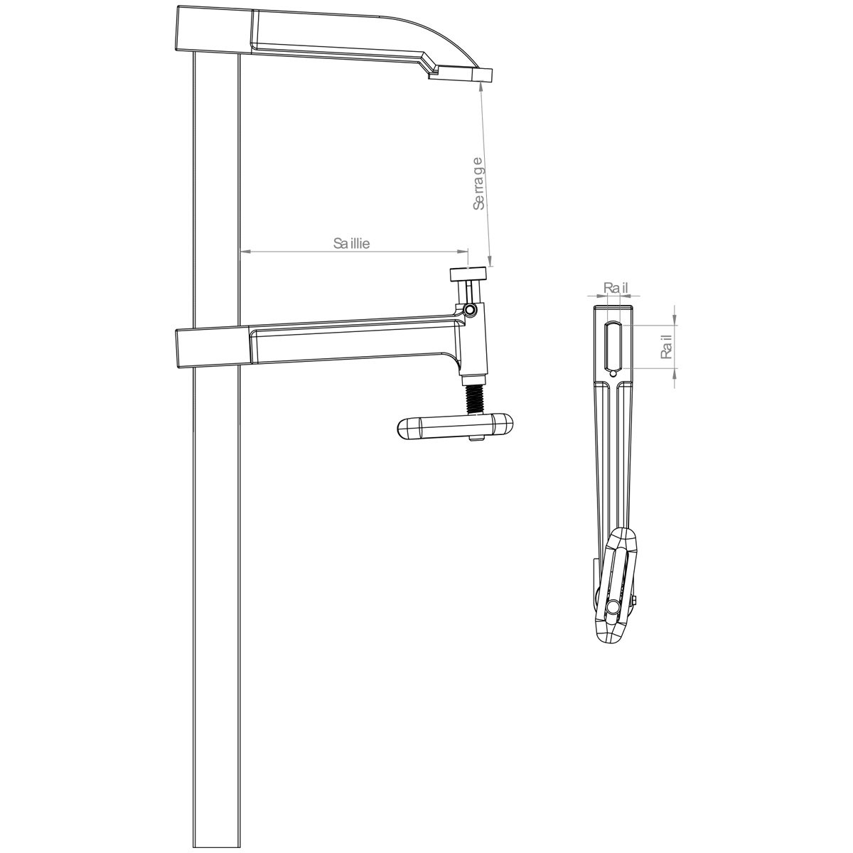 | Longueur (mm) | Largeur (mm) | Hauteur (mm) | Force (daN) | Rail (mm) | Saillie (mm) | Serrage (mm) | Poids (kg) | ||