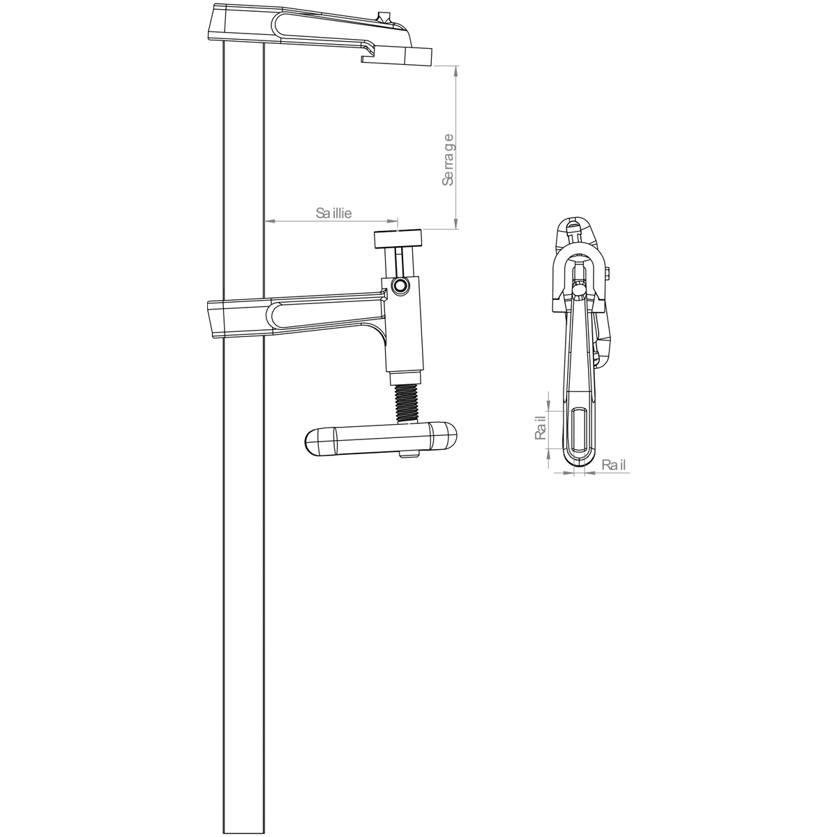 | Longueur (mm) | Largeur (mm) | Hauteur (mm) | Rail (mm) | Saillie (mm) | Serrage (mm) | Poids (kg) | ||