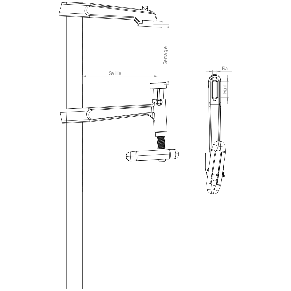 | Longueur (mm) | Largeur (mm) | Hauteur (mm) | Rail (mm) | Saillie (mm) | Serrage (mm) | Poids (kg) | ||