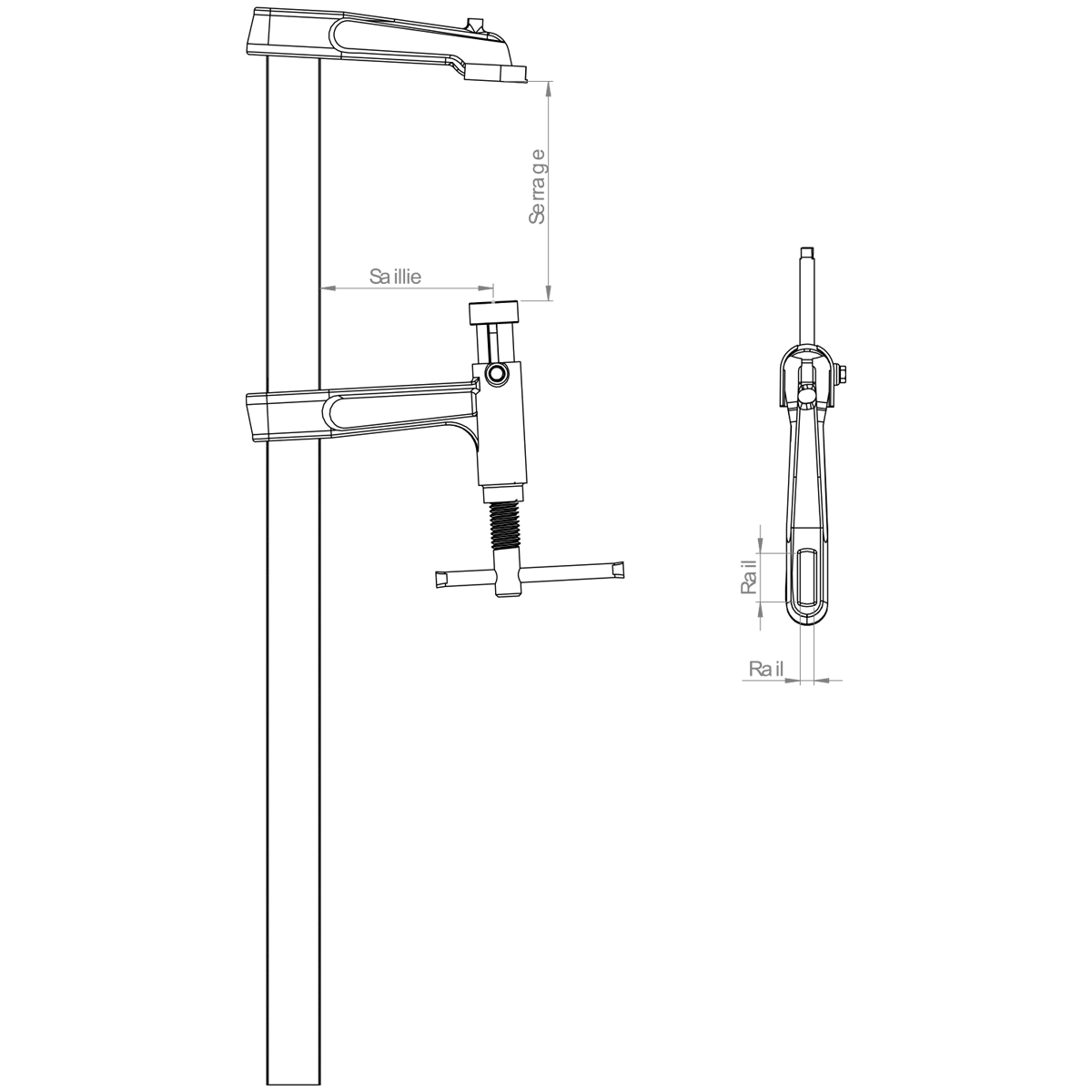 | Longueur (mm) | Largeur (mm) | Hauteur (mm) | Rail (mm) | Saillie (mm) | Serrage (mm) | Poids (kg) | ||