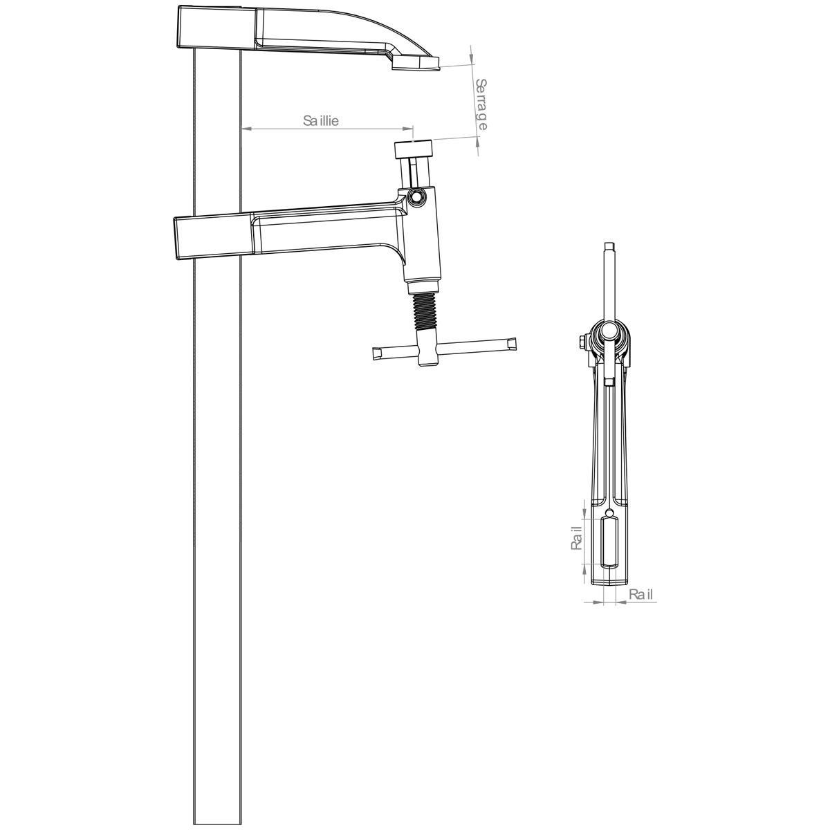 | Longueur (mm) | Largeur (mm) | Hauteur (mm) | Force (daN) | Rail (mm) | Saillie (mm) | Serrage (mm) | Poids (kg) | ||